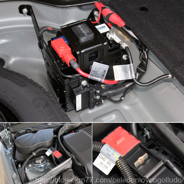 En la foto superior, en el rectángulo grande, aparece la batería auxiliar. En los pequeños, la batería normal (que no se ve) y una pieza de plástico roja que, al deslizarla, da acceso a una conexión metálica. Esta conexión va cableada hasta la batería y sirve para poder arrancar el coche con unas pinzas ya que no hay acceso directo hasta la batería.