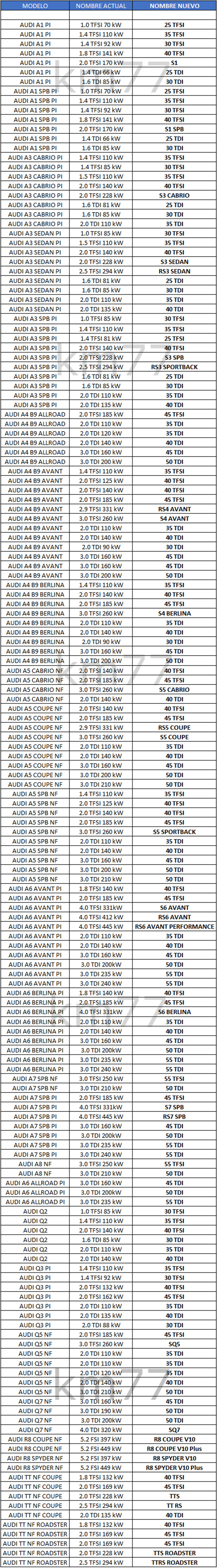 Hace casi un año, Audi anunciaba una nueva estrategia para denominar sus versiones según el motor. Tal y como contábamos aquí, dos números identificarán un intervalo de potencias en kW.