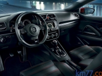 En el interior, el Scirocco GTS mantiene los colores negro y rojo del exterior. Las inserciones en la consola central, en las salidas de ventilación, en las puertas son en negro lacado. Los asientos tapizados en cuero negro tienen costuras dobles en rojo. Igual que la palanca de cambios y el volante deportivo. El logotipo «GTS» también está presente en el interior, ya que aparece en los respaldos de los asientos y en las molduras de entrada.