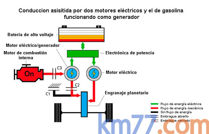 La máquina M1 funciona exclusivamente como motor, mientras que la M2 hace de motor y de generador, según las circunstancias. También hay tres embragues: uno (C3) acopla el motor de gasolina a la máquina M2. Otro (C2) acopla esta máquina M2 a la corona del engranaje planetario y un tercero (C1) hace solidaria esa corona a un elemento fijo.