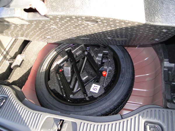 Por debajo de esta bandeja, está la rueda de repuesto de medidas de emergencia (que para España es una opción que cuesta 50 euros). Creo que habría sitio para una rueda del mismo tamaño que las otras cuatro, pero habría que comprobarlo porque el Mokka puede llevar ruedas muy grandes: