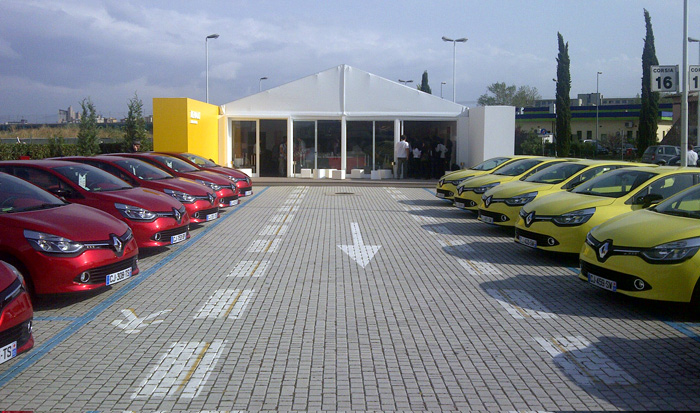 Renault ha presentado la cuarta generación del Clio en Florencia, Italia. Los coches esperaban alineados en el aparcamiento del aeropuerto, de color rojo sport el equipo dCi 90, de color amarillo deseo, la selección TCe 90.