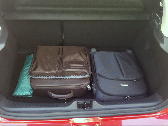 El maletero es grande. Las maletas de la foto son de las que dejan subir, normalmente, como equipaje de mano a los aviones. Bajo el piso del maletero está el gato y el kit de reparacion de pinchazos. Y el mecanismo para hacer descender la rueda de repuesto (opcional), que va colocada en el exterior, por debako del maletero. En el portón hay dos huecos para poder meter la mano y cerrarlo sin ensuciarse.