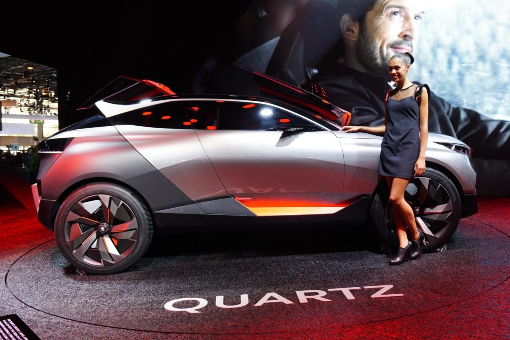 El Quartz es un prototipo de cuatro plazas que, según Peugeot, resulta de la fusión de un todoterreno y una berlina. Es un híbrido enchufable. El sistema de propulsión está compuesto por un motor de gasolina de 1,6 litros, 4 cilindros y 270 CV —1.6 THP 270— y dos motores eléctricos (uno por eje) de 115 CV cada uno. La potencia máxima es de 500 CV. El motor eléctrico del eje anterior, además de impulsar el coche, asiste al motor térmico en los cambios de marchas. Más información sobre este prototipo.