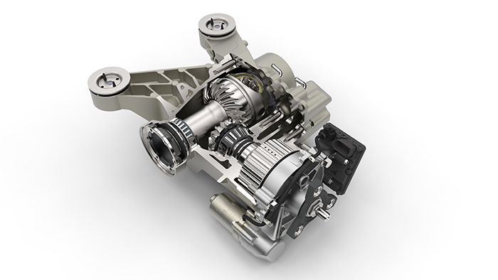 El dispositivo que acopla el eje trasero al delantero es un embrague multidisco (de tipo Haldex de 5ª generación y está colocado en el eje posterior, junto con el diferencial trasero). El diferencial trasero, como el delantero, tiene un sistema electrónico de bloqueo (llamado EDL) que actúa a baja velocidad y cuando detecta que hay diferencia de velocidad de rotación entre las ruedas de un mismo eje, aplica freno sobre la que gira más rápido y desvía más par hacia la que va más lenta, que es la que supuestamente tiene más adherencia. Además, hay un sistema llamado XDS+, cuyo objetivo es simular el efecto de un diferencial de deslizamiento limitado. Actúa en las curvas, frenando la rueda interior al giro para prevenir que esta derrape.