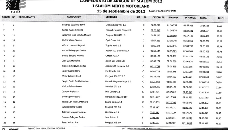 A la segunda manga, la definitiva (se tiene en cuenta el mejor tiempo de las dos), salgo pensando en ir a lo que pueda y que si me paso de largo algún cono sería mi justo castigo. Finalizo la vuelta con mal sabor de boca, la zona inicial de tierra me ha parecido que estaba más lenta y también he hecho mal el giro de 360 grados, un sitio donde se pierde tiempo. Al terminar, Sergio me pregunta qué tal. Le respondo con sinceridad “mal, he debido perder dos segundos más”. Así que me encuentro entre cabreado conmigo mismo y pensando que las pocas opciones de optar al campeonato se habían esfumado.
