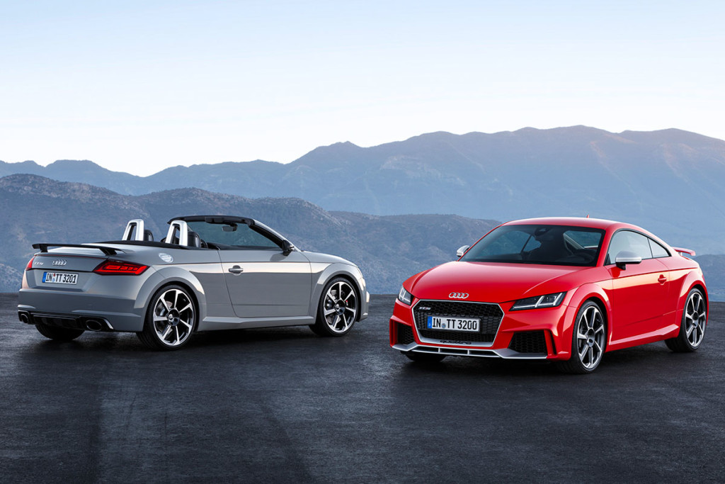 Los Audi TT RS Coupé y RS Roadster son las versiones más potentes y deportivas de la gama TT. El motor que tienen las versiones RS es de gasolina de cinco cilindros en línea, 2,5 litros de cilindrada y da 400 caballos y 480 Nm de par máximo entre 1700 y 5850 rpm. Solo está disponible la transmisión automática de doble embrague S tronic de siete velocidades y la tracción total quattro.