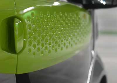 Su aspecto y proporciones —2,53 metros de longitud y 1,56 m de anchura— me recuerdan sin duda al smart EQ fortwo, quizás porque esta sea la única forma que se puede dar a un coche de dos plazas que ocupe el menor espacio posible y tenga un aspecto medianamente agraciado. Como en el smart, el interior es diáfano, el parabrisas está alejado y tras los dos asientos se encuentra el maletero. El smart es sin lugar a dudas «más coche»: más potente (82 CV), más equipado, mejor acabado, con mejores cualidades dinámicas y más seguro. Pero cuesta y pesa el doble. Que pese el doble (1095 kg frente a 522 kg) conlleva que su consumo sea mayor y que desplazarse en él salga más caro.