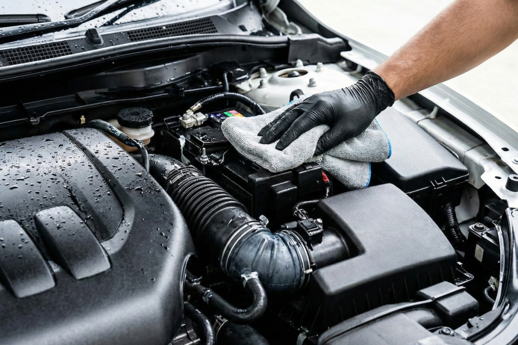 - Motor frío y cubierta protectora: Antes de limpiar, asegúrate de que el motor esté completamente frío. Además, cubrir piezas sensibles, como la batería, alternador, los sensores, bobinas de encendido y las centralitas, con bolsas de plástico o trapos.