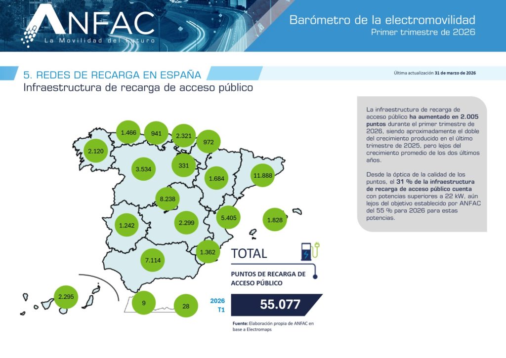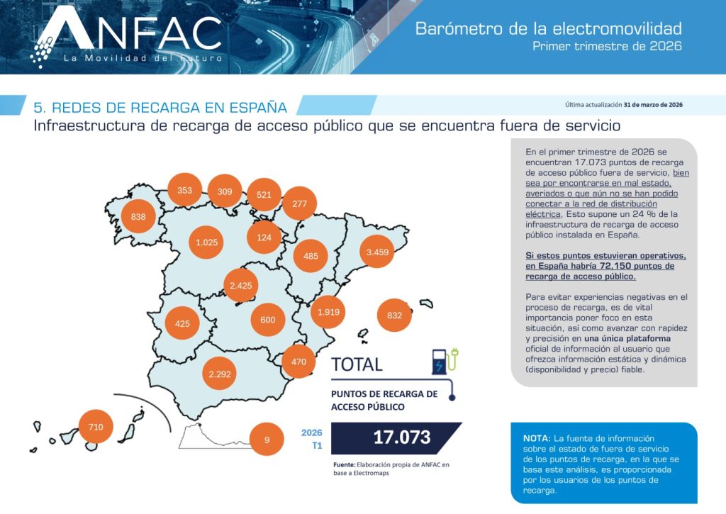 España ha aumentado en el primer trimestre de 2026 los puntos de recarga en un 3,8 %, instalando 2005 nuevos cargadores de uso público. Con ello, la cifra llega hasta los 55 077, número aún insuficiente para lograr los objetivos y equipararse a la media europea (no obstante, lo importante no es la cifra en sí, sino también la potencia, su ubicación y fiabilidad). Más aún cuando se analiza un dato clave: uno de cada cuatro cargadores no se pueden usar. Un total de 17 073 puntos de recarga inactivos, por las razones que sean (problemas técnicos, burocráticos, falta de conexión a red, etc), que lastran aún más una infraestructura escasa para la transición al vehículo eléctrico.