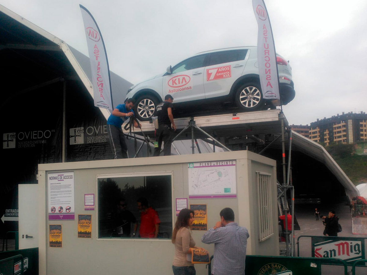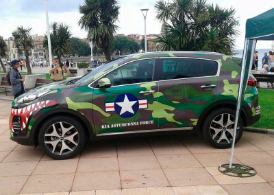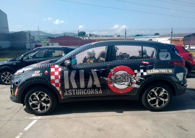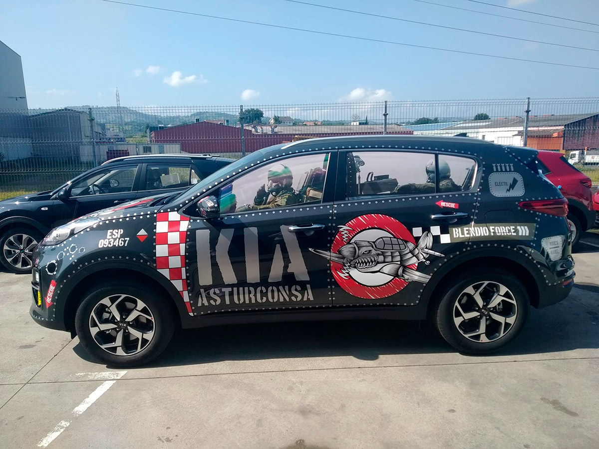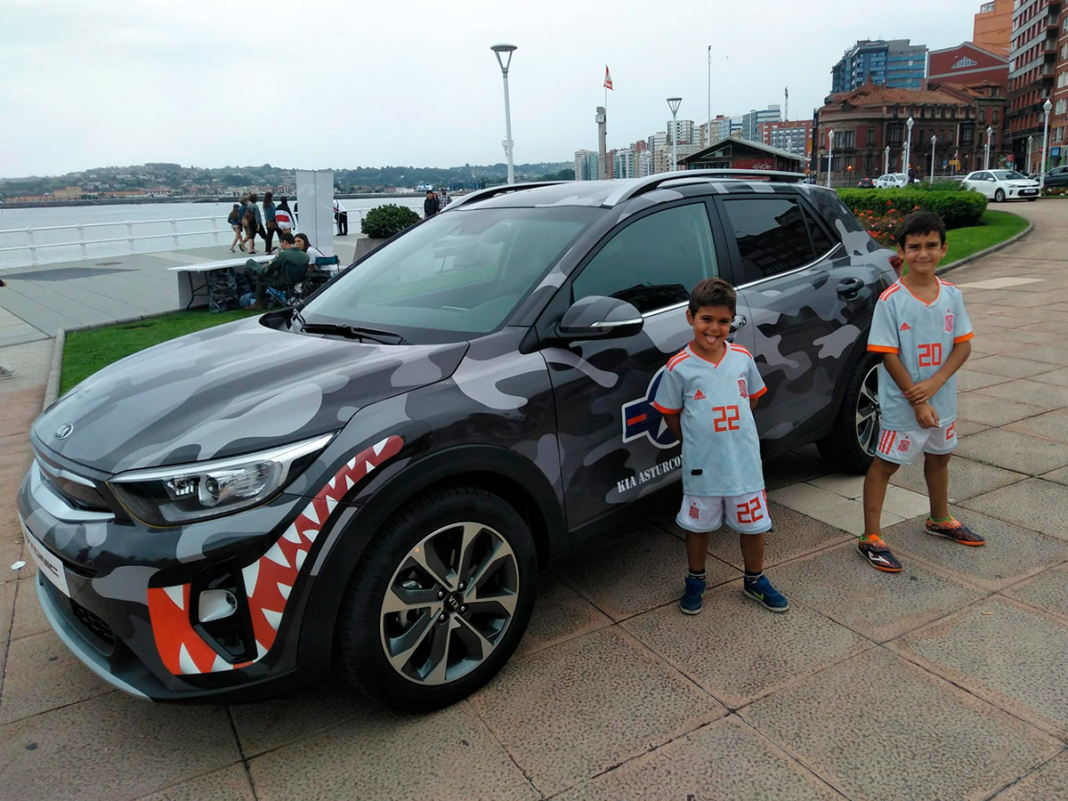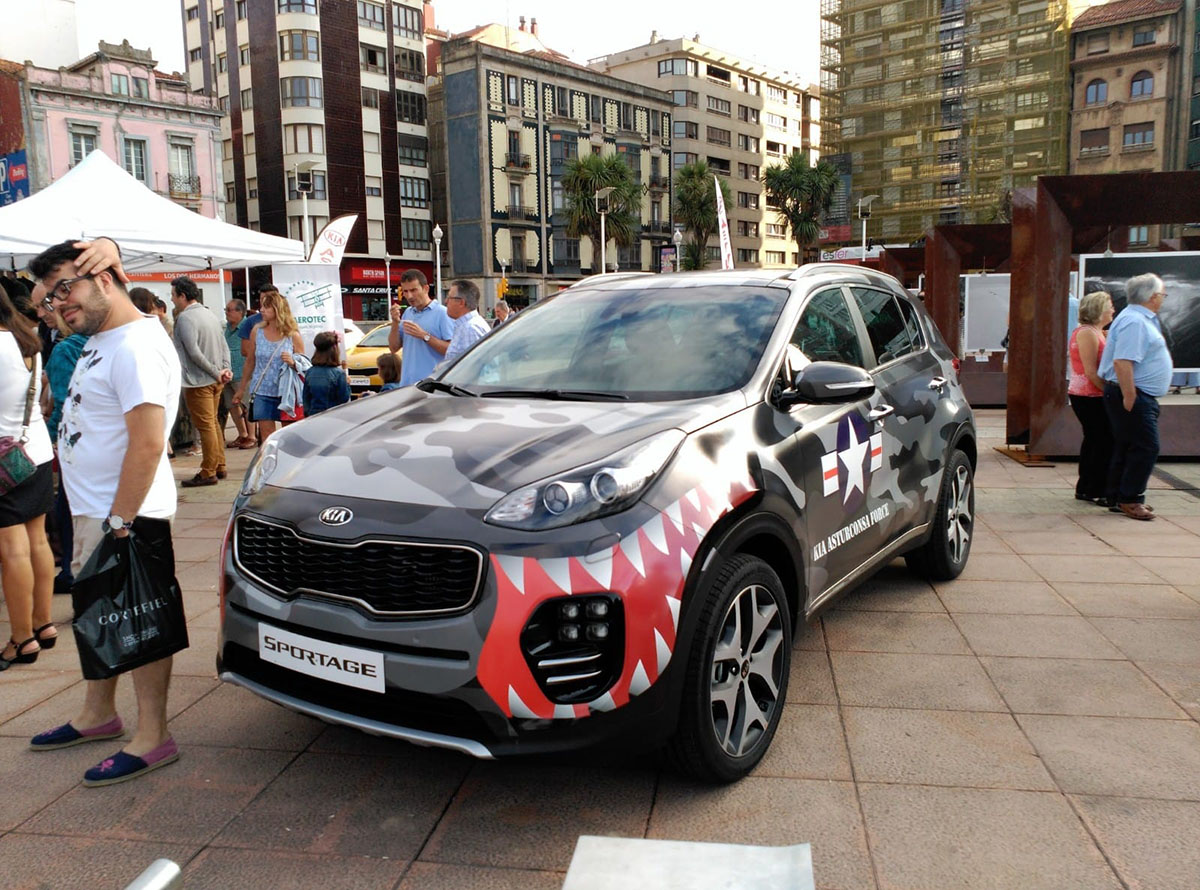 Javier Barrera, gerente de Asturconsa, vive su trabajo y lo cuenta con pasión. De todo lo que me cuenta, me quedo con una frase: «Nos gusta mucho estar en la calle». Y relata con detalle las decenas de eventos y patrocinios, ideas y montajes espectaculares que desarrollan continuamente para llegar a los ciudadanos, a los vecinos, a los niños. Coches subidos sobre plataformas altísimas que hay que bajar de urgencia por amenaza de temporal, hasta espectáculos con dobles de Michael Jackson. Pero, de todo lo que me cuenta y me muestra, me maravillan los coches decorados con tanto mimo y tan bien para crear un escuadrón de coches como aviones para la «Kia Asturconsa Force». Creo que no he visto un coche decorado tan bonito como este Sportage que aparece en la foto de abajo en toda mi vida. ¡Felicidades! Así da gusto trabajar. Con cariño y con mimo. Javier no sólo lo cuenta con pasión. Me enseña y me envía para que pueda publicar fotos y fotos de cada una de las «locuras» en las que se embarcan. Siete cocineros, siete, todos con estrella Michelin, estuvieron en el acto de inauguración del concesionario. 7 cocineros 7, que están relacionados con los años de garantía de Kia, pero que a mí me recuerdan al 77 de km77. Me encantaría transmitir el mismo amor por las cosas bien hechas en esta casa.
