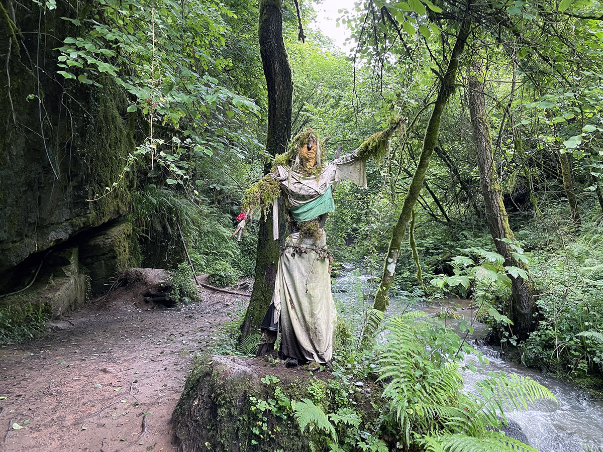Hay un elemento adicional que convierte La Senda de los Molinos del Río Profundo en un sendero mágico, que complementa perfectamente al paisaje y a los molinos. Elfos, busgosos (seres de la mitología asturiana), gigantes, «trasgos y duendes» realizados por el artista «Herny», según relatan en el diario La Nueva España. Felicidades «Herny». Este hombre, por iniciativa propia, ha esparcido delicadamente a lo largo del camino a estos seres de fantasía, que crean una atmósfera de cuento absoluto. La vegetación encarnizada, el sonido constante del agua, los molinos que también aportan algo de fantasía porque es imposible no imaginarlos con sus molineros y clientes, con los sacos de harina y sus alpargatas, con los pies descalzos andando por el río, con el sonido de las muelas y de las aspas golpeadas por el agua. En ese entorno fabuloso, los seres de «Herny» te transportan al mundo de la fantasía. Irremediablemente. Algunos, incluso, dan un poco de miedo. Maravilloso.