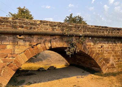 No es un puente tan imponente como el «Puente Romano» de Andújar, pero con el mismo valor para la curiosidad. De este puente me sorprende especialmente lo que me dijo Encarni, la guía del Balneario de Marmolejo. «Está hecho con piedra azucareña, llamada así porque se deshace como el azúcar». En mis reportajes no tengo el objetivo de contrastar todo lo que me dicen y por tanto desconzco si la piedra del puente de Marmolejo se deshace como el azúcar o no. Lo que sí sé es que aparentemente el puente lleva varios siglos construido y las piedras no se han disuelto en el agua. O quizá sí. ¿Quién sabe? Y por la noche vienen los duendes a reponerlas.