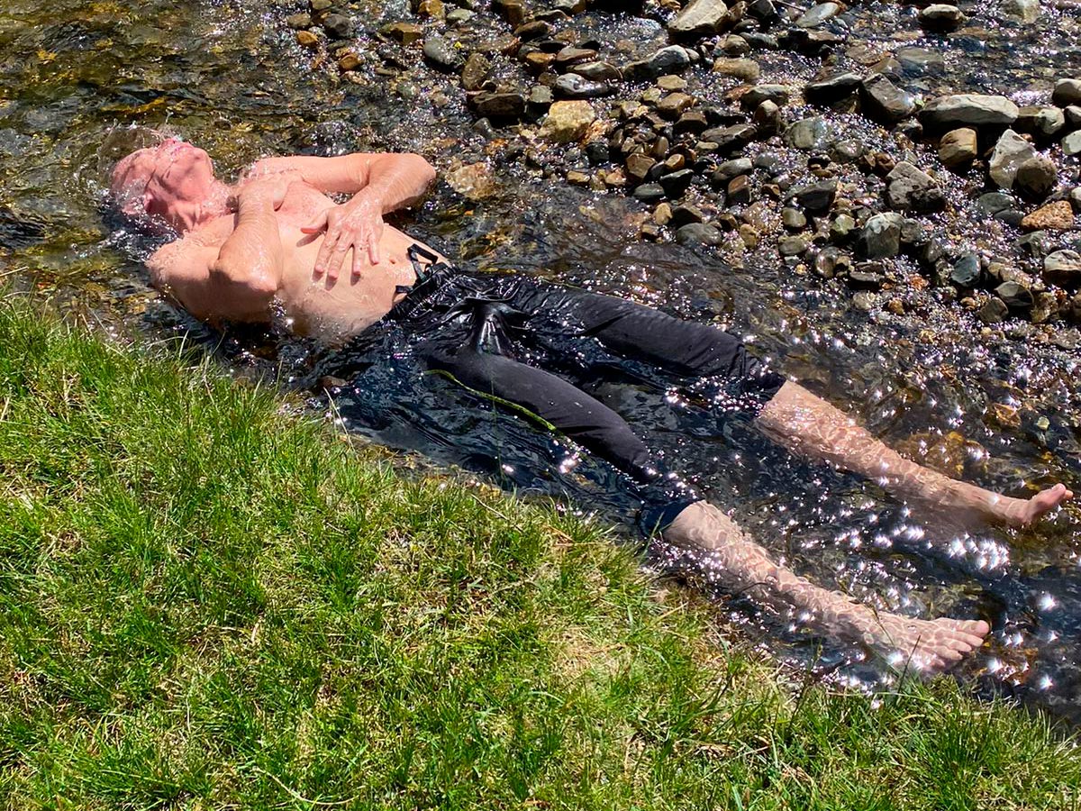 Para celebrarlo, metemos los pies en el agua. ¡Agua helada, por Tutatis! No cubre, pero me pongo un pantalón que llevo en la mochila y me baño entero.