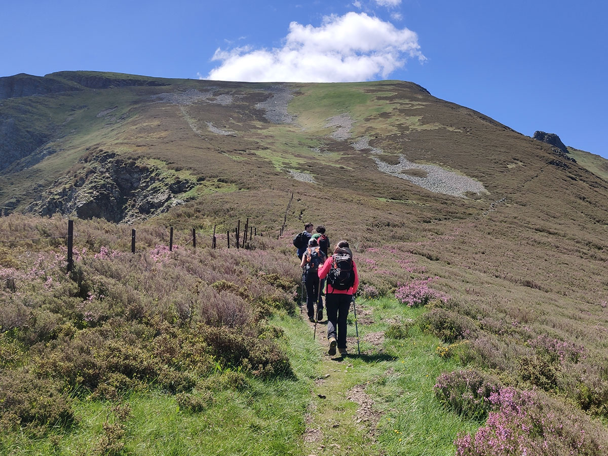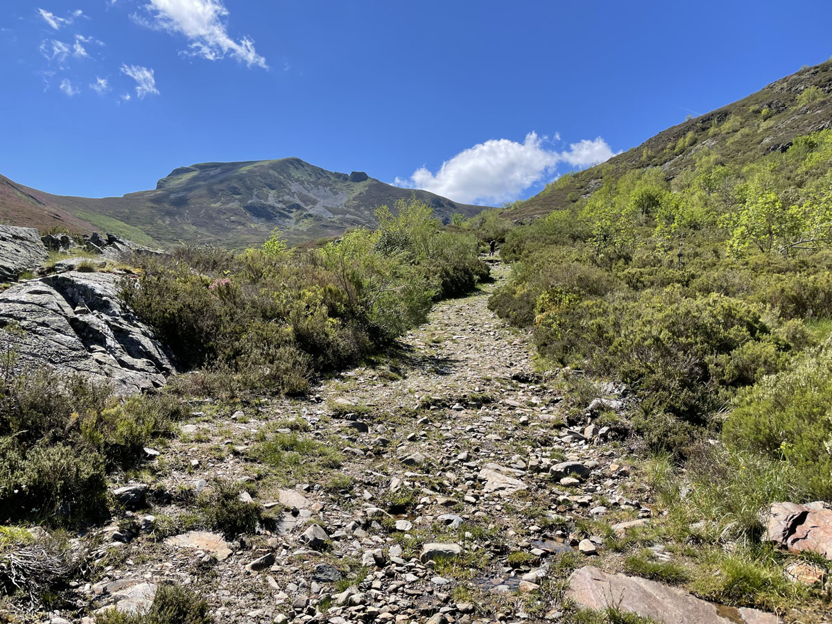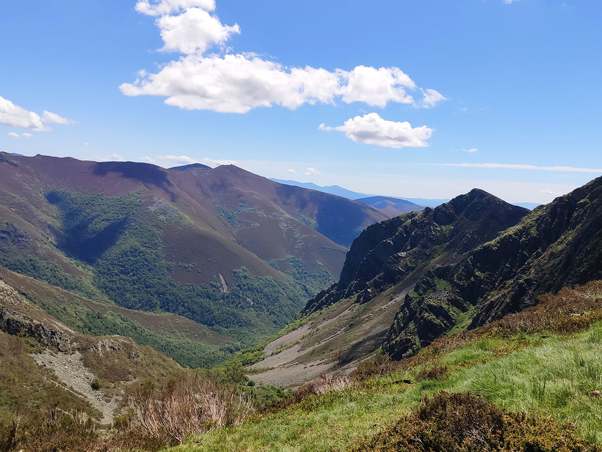 La subida, como todo Lugo, está formada por un gigantesco mantón verde, de verde de todos los colores, con diferentes ondulaciones, salpicado de riachuelos, árboles y animales. Lourdes y Rosa, que están vacunadas, como yo, suben a buen ritmo por las laderas adyacentes al Mustallar. A ratos en silencio y en otros hablamos hasta de coches. Según Lourdes, que acaba de cambiar su coche con motor diésel por un híbrido, los híbridos son una estafa: “El diésel gastaba muchísimo menos”. Tampoco tiene ninguna duda de que el cambio automático es cien mil veces mejor que el cambio manual.