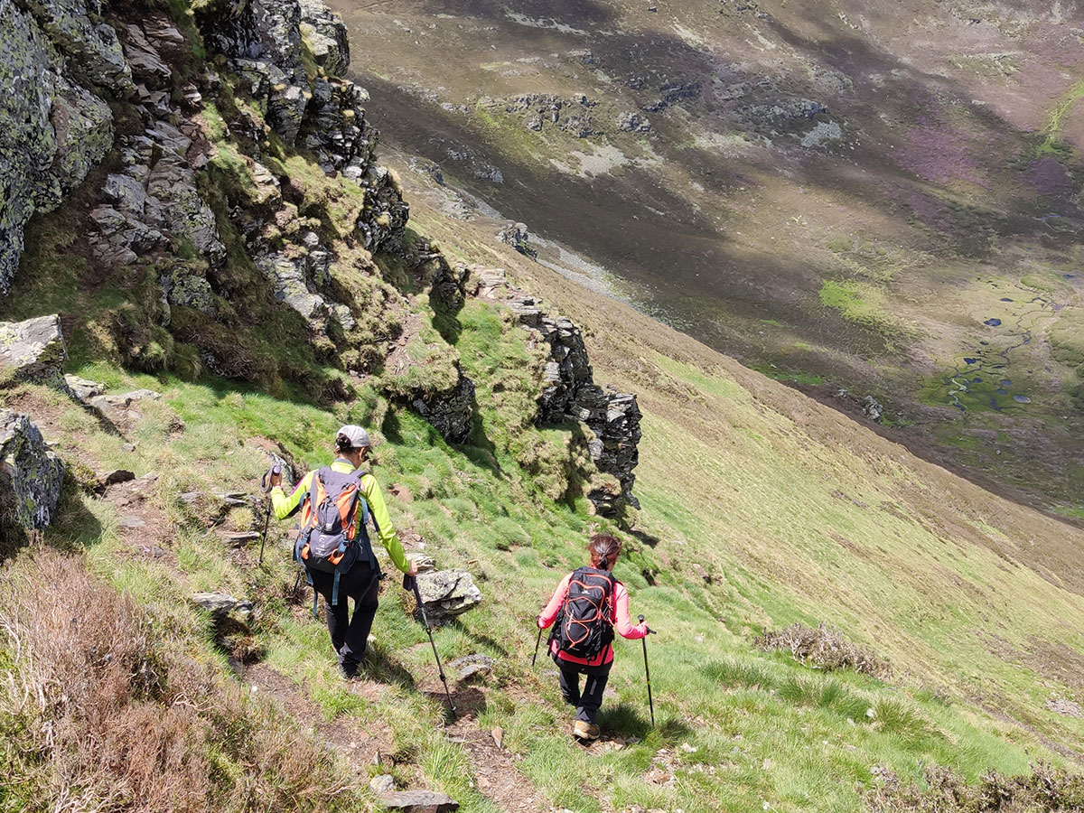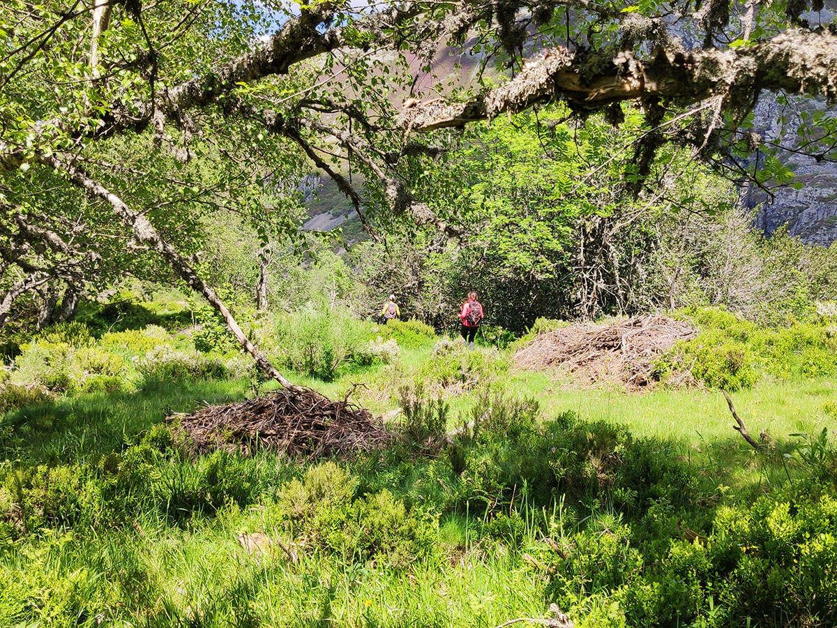 En esas situaciones, en las que no avanzas, el mimo y el cuidado entre Lourdes y Rosa ayuda a aliviar el trago. Lourdes delante, Rosa en medio y yo detrás intentamos avanzar. Poco a poco. En algún lugar “ya que me habéis adoptado tendré que hacer algo” avanzo yo por delante, para investigar. Finalmente, un grito de Lourdes que suena a “Tierra” anuncia el camino. Un camino ancho y esplendoroso, al que llegamos instantes después Rosa y yo. “Mira, la ruta77”, dice Lourdes. Pocos minutos después, al encontrar un puente que habíamos cruzado de subida, perfectamente distinguible y que confirma que vamos bien, Rosa gira la cabeza con una sonrisa que ilumina el valle: “Qué mal se pasa y qué feliz estoy ahora”.