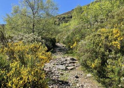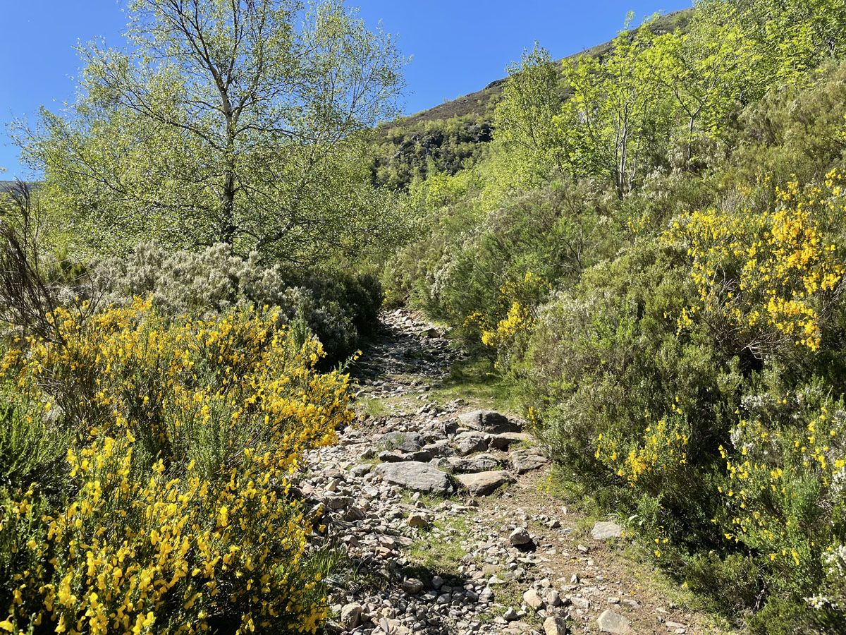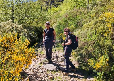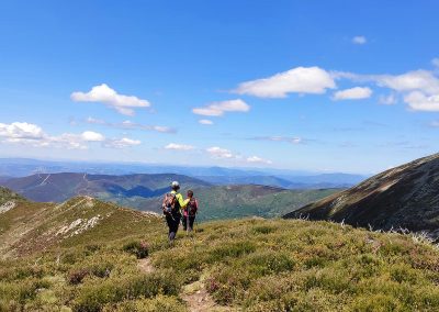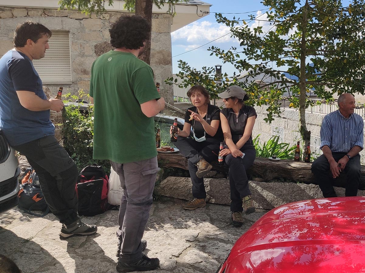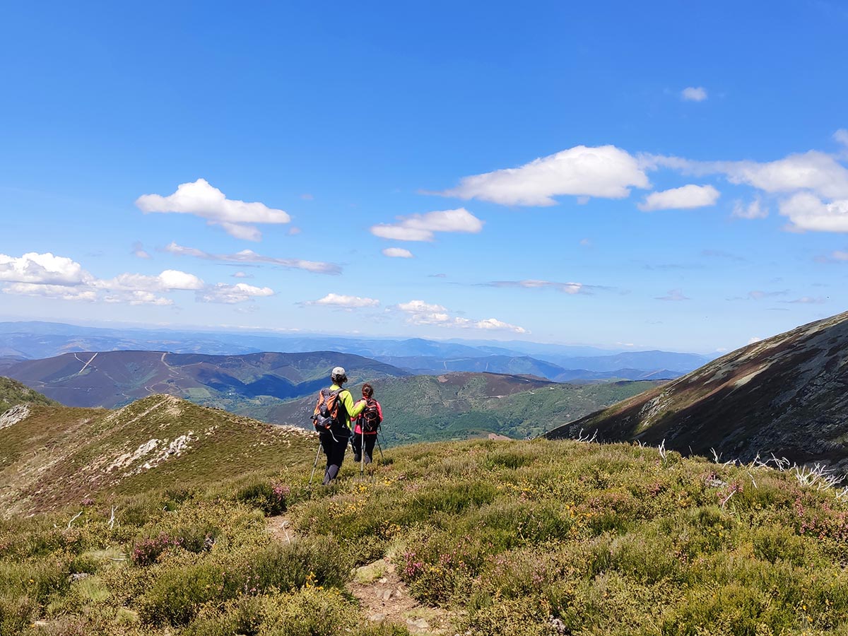 Subir juntos a la montaña no implica caminar codo con codo ni charlar continuamente. Por si acaso, durante los primeros metros, con la excusa de tirar la botella de agua en el contenedor me quedo un poco retrasado, pero, enseguida, antes incluso de llegar a Piornedo, población desde la que arrancamos, ya estamos hablando de forma espontánea.