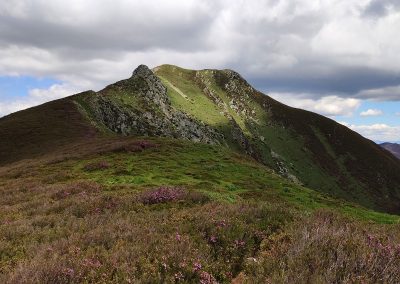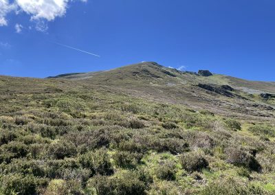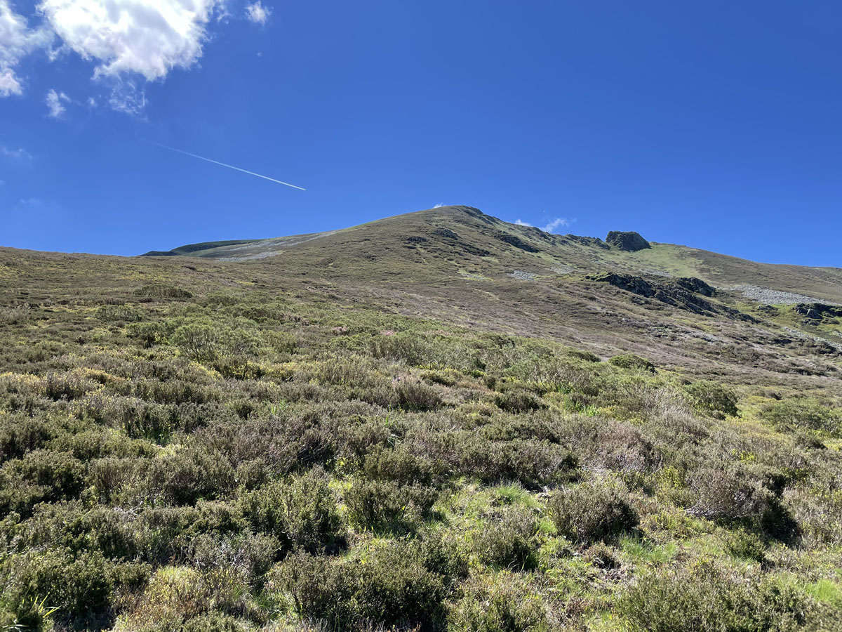 Antes de la última cuesta hasta la cumbre, nos detenemos a descansar, a beber y a hacer fotos. Mientras estamos detenidos llegan dos hombres, uno de ellos de la zona, que nos da mil datos de las montañas de alrededor, de los pueblos de alrededor, de las posibilidades de descenso de alrededor… Todo a una velocidad inusitada y en gallego. A mí me parece que lo entiendo todo, pero en realidad no entiendo nada. Claro que si lo entendiera tampoco lo retendría. Soy más de perderme que de recordar.