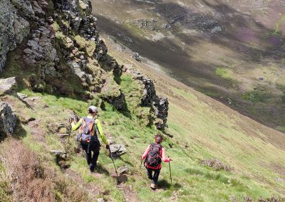 Rosa y Lourdes caminan mucho y viajan mucho y es un placer escuchar sus anécdotas en excursiones en España y en otros países del mundo. Tienen una organización envidiable de su vida, en la que alternan sus familias y la reserva de su espacio y tiempo para sus excursiones. Se aprecia entre ellas una relación deliciosa. De respeto y cariño, de complicidad y cuidado. Me cuentan sus fiestas temáticas, marcadas a fuego en sus agendas, en las que se reúnen año tras año un grupo de amigas. Les digo que no encuentro habitualmente mujeres que vayan solas por la montaña. “Hay muchas”, me contesta Lourdes. Es posible, pero yo no encuentro habitualmente. Por si acaso, sigo pendiente durante un buen rato de cualquier señal que me indique que prefieren estar solas, aunque me cuentan cosas y me hacen partícipe de todo, por lo que intuyo que están tan a gusto como yo.