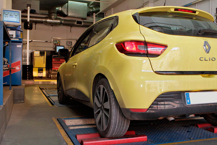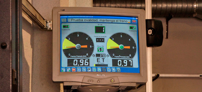 La prueba de frenada se hace colocando las ruedas de cada eje sobre unos rodillos y a continuación presionando progresivamente el pedal del freno hasta el final de su recorrido. Los resultados incluyen dos valores importantes. Por una parte, el de fuerza máxima de frenado, y por otra, el que indica si la frenada es equilibrada entre las dos ruedas de cada eje. Todos los resultados obtenidos están dentro de los valores considerados como «normales». La fuerza de frenado es similar en los dos coches, si bien nuestro Clio tiene la frenada mejor equilibrada en el eje trasero.