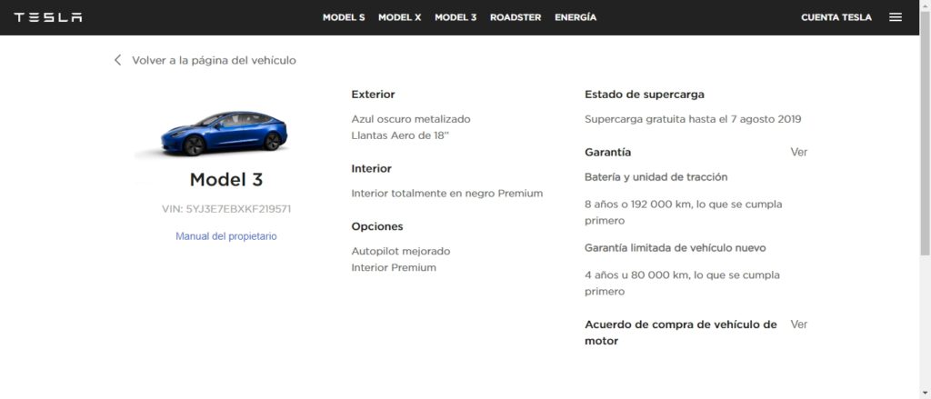 El coche nos lo entregaron el 23 de febrero de 2019 (vídeo de la entrega). En la primera recarga comprobamos que, efectivamente, podíamos usar la red de supercargadores sin tener que pagar. Pocos días después de la compra observamos en nuestra zona personal de la web de Tesla que aparecía el 7 de agosto como fecha de finalización del periodo gratuito. Es decir, cinco meses y medio en vez de los nueve prometidos.