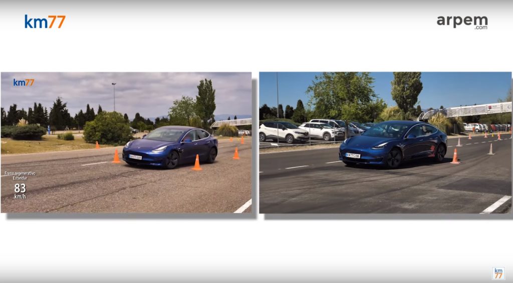 Como se puede ver en el vídeo adjunto, esta segunda prueba la hemos superado a 83 kilómetros por hora, la misma velocidad que la primera vez. En ambas ocasiones, el conductor ha sido el mismo. El freno regenerativo seleccionado ha sido el que Tesla llama «Estándar», es decir, el que da mayor retención de los dos disponibles. Con él, el Tesla pierde velocidad a mayor ritmo de lo habitual que en un coche con motor de combustión, característica que lo beneficia. No fuimos capaces de conseguir esta velocidad a la entrada del ejercicio con el modo de retención menor.