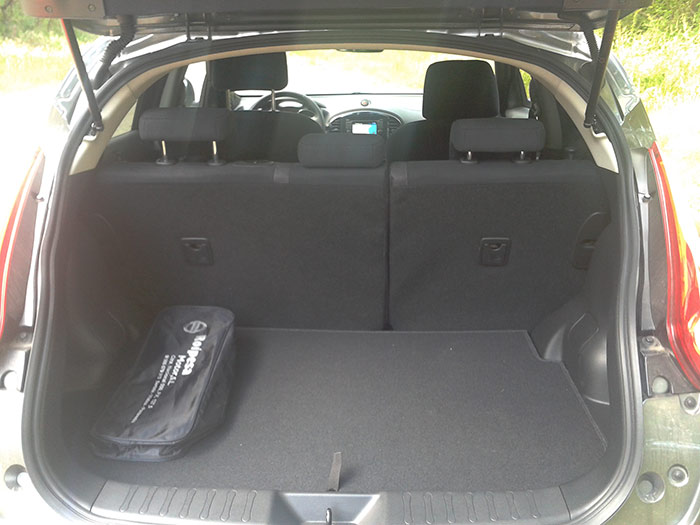 Las plazas delanteras son suficientes y cómodas, con asientos de buen mullido que lógicamente no recogen el cuerpo como los baquets de las versiones Nismo. Sólo se echa en falta un reposabrazos central (disponible como accesorio). Las plazas traseras son más justas y tres adultos lo pasan mal, no es fácil subirse a ellas por las dimensiones de sus puertas y tampoco disponen de plafón. Por lo tanto, a pesar de ser un cinco puertas se nota que está orientado a dos ocupantes, como segundo coche o para parejas jóvenes sin hijos. Y lo de sin hijos es relevante, ya que con un ridículo maletero de 207 litros cabe una silla de paseo y nada más. Se debe de nuevo a que es necesario hacer hueco para la suspensión independiente y al sistema de tracción integral, ya que las versiones de tracción delantera tienen eje torsional y más maletero.