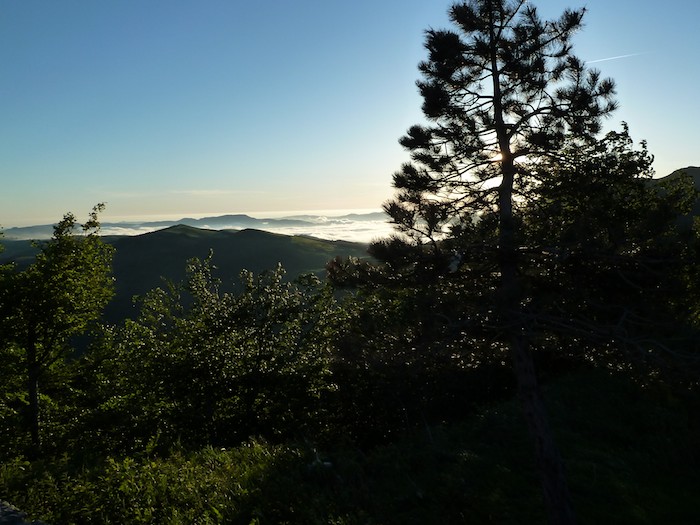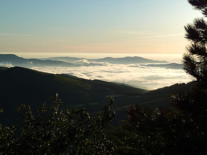 Por la localizacion del sol ,si usted dice que es el amanecer está claro que es un paisaje que mira hacia el norte.Montañas verdes ,neblina ,horizonte ….,mar o más neblina,puede ser un paisaje del norte,Asturias ;Cantabria ;Pais Vasco ….qiuen sabe.