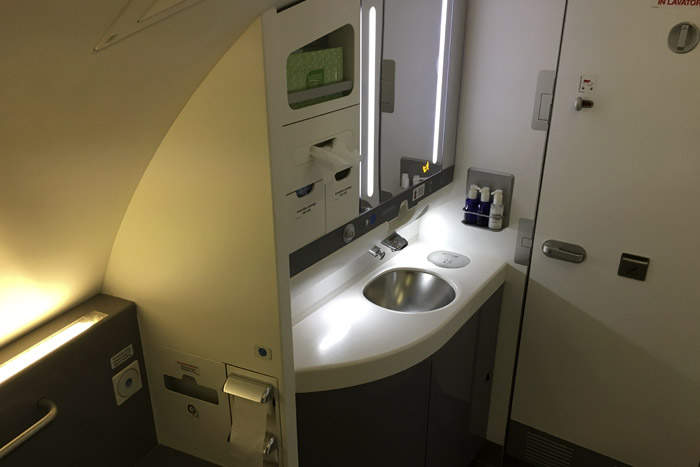 Fíjense en la amplitud. En el vuelo de regreso elegí el piso inferior, para conocer las diferencias. Los baños del piso inferior son pequeños, como los de todos los aviones. En caso de poder elegir es mucho mejor optar por el piso superior. Hay un pasajero menos por fila, por lo que hay menos personas que atender, menos personas que quieren saltar para salir de sus asientos, menos esperas y los baños son infinitamente mayores. No hay color.