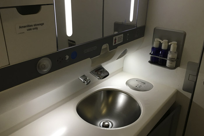 A pesar de lo grande que es el baño y de que sobra espacio, el lavabo está encastrado debajo de unos cajones. Imposible meter la cara para lavársela sin mojarlo todo. Cuando los baños son diminutos el tamaño mínimo del lavabo situado bajo el armario es comprensible. Cuando hay espacio de sobra, cuesta de entender. Así sucede que el suelo de los aviones y los alrededores del lavabo están siempre mojados. Dediqué un buen tiempo de secado y limpieza para las fotos.