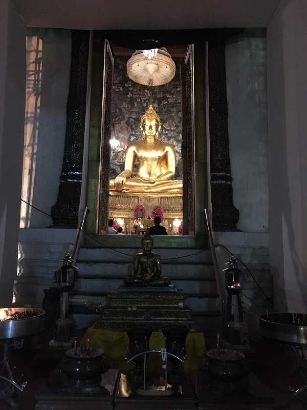 Durante el paseo, me he pegado de sopetón con un Buda enorme en un templo que está en obras. Es el templo de Wart Suhat. No lo buscaba, pero me lo he encontrado. Y ha sido una suerte infinita. No había nadie en el templo. Un monje rezando y unas 50 personas sentadas en el suelo siguiendo las oraciones con un libro delante y las piernas cruzadas en la misma posición que el Buda. Si no llego a tener la seguridad de que me rompo, hubiera intentado sentarme en esa posición. Se trata de un templo muy bello y muy tranquilo.
