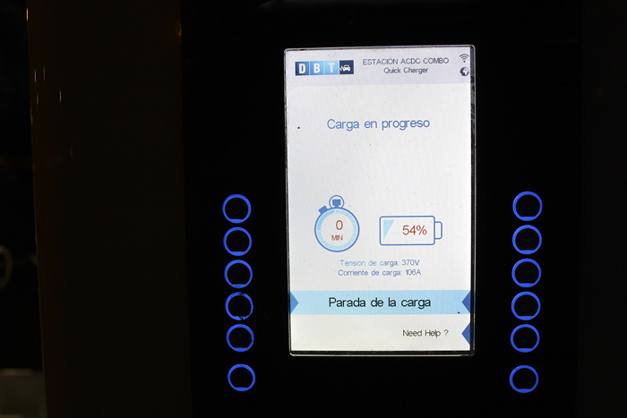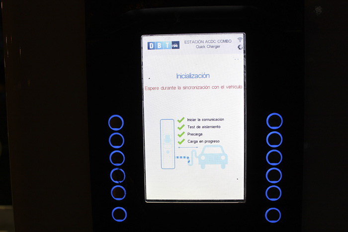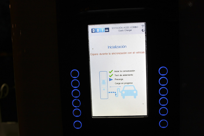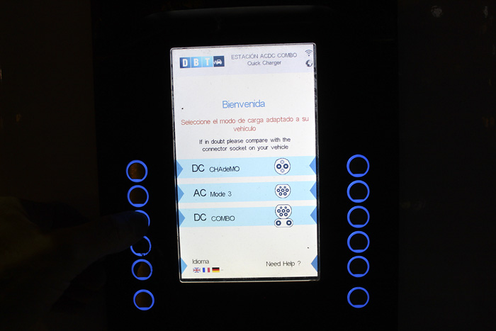 En la pantalla de bienvenida se queda una mezcla de idiomas. Con el dedo señalo la opción rápida de corriente continua con conector Combo, el que se ajusta al BMW i3.