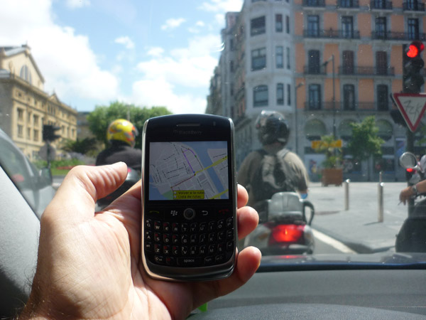 El coche no tiene navegador y utilizo el GPS de mi Blackberry, con Google Maps, que me lleva por calles de San Sebastián que desconozco. Doy varias vueltas a causa de las obras y, aunque he salido con tiempo, cada vez me acerco más a la hora límite. Se cumple la hora cuando estoy cerca del hotel, ya es la tercera vez que pregunto. Todos me dicen que está aquí al lado, pero estoy metido en una urbanización de la que no consigo salir. Finalmente llego a una rotonda buena y un motorista me indica perfectamente. Entro en el aparcamiento del hotel con tres minutos de retraso. Mal. Aun así, faltan siete minutos para la hora de cita con los músicos. El resto de conductores está tranquilo. Bien.