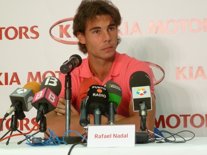 Nadal llega a la rueda de Prensa organizada por KIA y los fotógrafos empiezan a disparar. Nadal no facilita el trabajo, baja la mirada, se toca la cara, se echa hacia atrás en su silla. Parece incómodo. Luego, en la conferencia de Prensa, cuando el Director General de KIA habla de él, también parece incómodo y da la impresión de que querría esconderse y desaparecer.