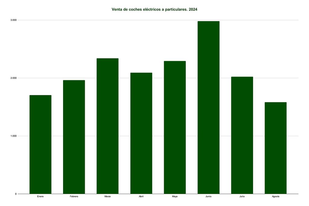 Si bien en agosto las ventas de eléctricos a particulares han caído casi un 20% con relación al mismo periodo de 2023, en el acumulado del año, las ventas a particulares se han incrementado prácticamente un 19%, por lo que habrá que esperar a los próximos meses para conocer cuál es la tendencia real del mercado. En julio el crecimiento se acercó al 50%, por lo que entra dentro de lo normal una caída de ventas en agosto, ya que es posible que este año se hayan anticipado ventas para poder disfrutar del coche en agosto.