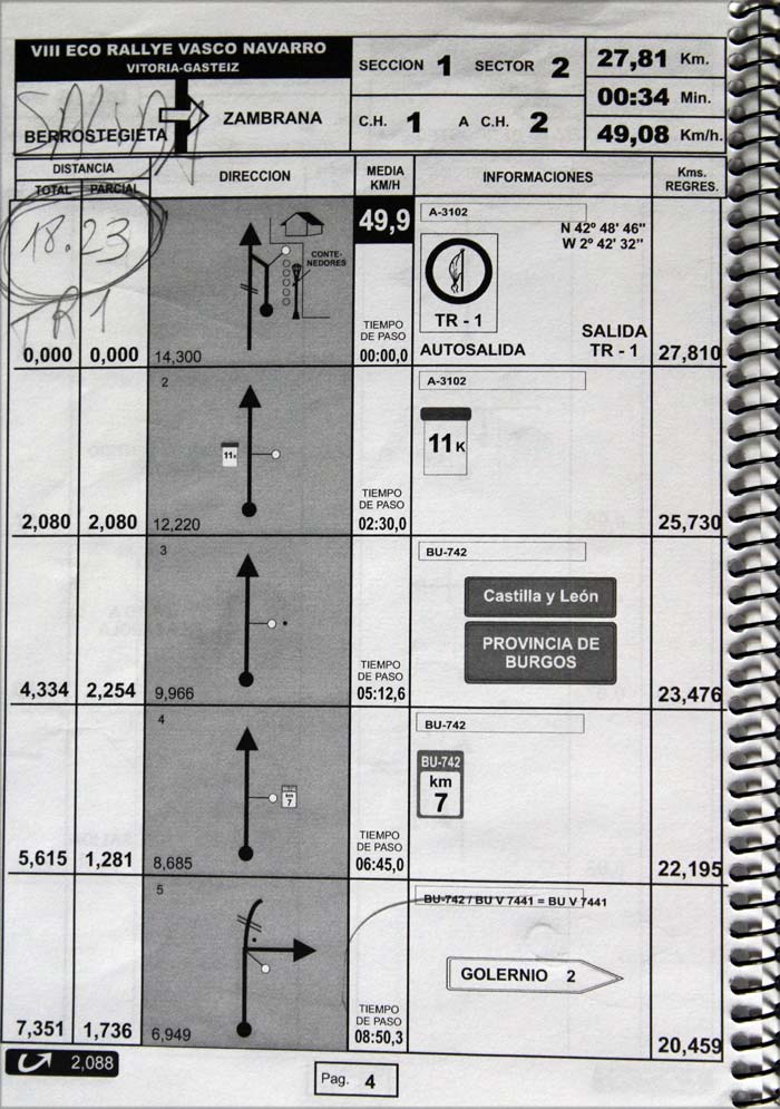 Los alfileres blancos que aparecen en cada viñeta reflejan el punto exacto donde el organizador ha medido la distancia que aparece reflejada en la columna de la izquierda. Por ejemplo, en este tramo, en el punto kilométrico «7» de la carretera «BU-742» teníamos que llevar exactamente 5615 metros recorridos. Si los aparatos de medida no dan esa cifra, hay que ajustarlos, porque de lo contrario están midiendo de forma diferente a como ha medido el organizador y por tanto es seguro que en todo lo que resta de tramo penalizaremos por falta de precisión, por muy hábil que sea el conductor y obedezca fielmente las órdenes de sus aparatos. Si los aparatos miden mal, las órdenes que den serán erróneas.