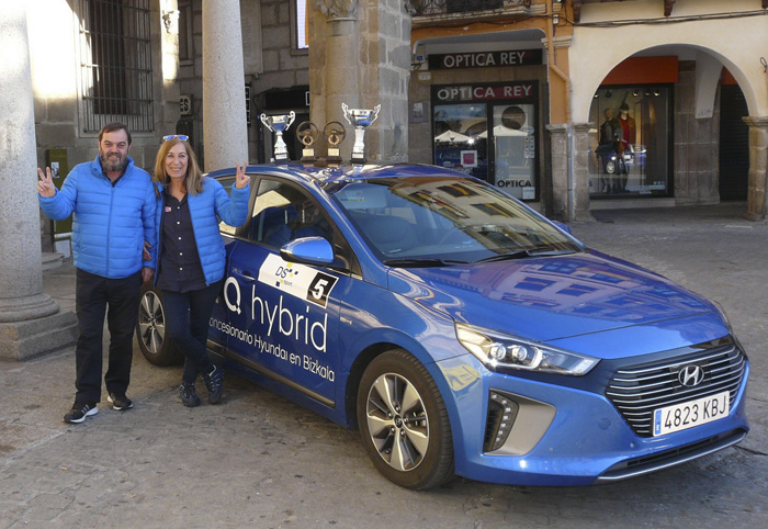 Pilar Rodas y Txema Foronda han ganado la Copa de España de Energías Alternativas 2017 para la categoría de vehículos híbridos en este rallye. Y en lugar de mandarme a freir espárragos (o a realizar cualquier otra actividad menos productiva) cuando les dije que nostros íbamos a repasar el primer tramo, si se querían venir para enseñarnos, inmediatamente dijeron que sí y nos contaron todos los detalles de cómo lo hacen ellos dos. Laura se fue con Txema en el coche y yo con Pilar. Llevar a la recién coronada Campeona de España en el asiento de la derecha me daba respeto. Pero Pilar me dio caña y me dijo cómo tenía que colaborar yo con «la copi». «No puede quedar todo en manos del copiloto y que el piloto se dedique a conducir. Eso no puede ser» me dijo Pilar. Así es como lo hacíamos nosotros.