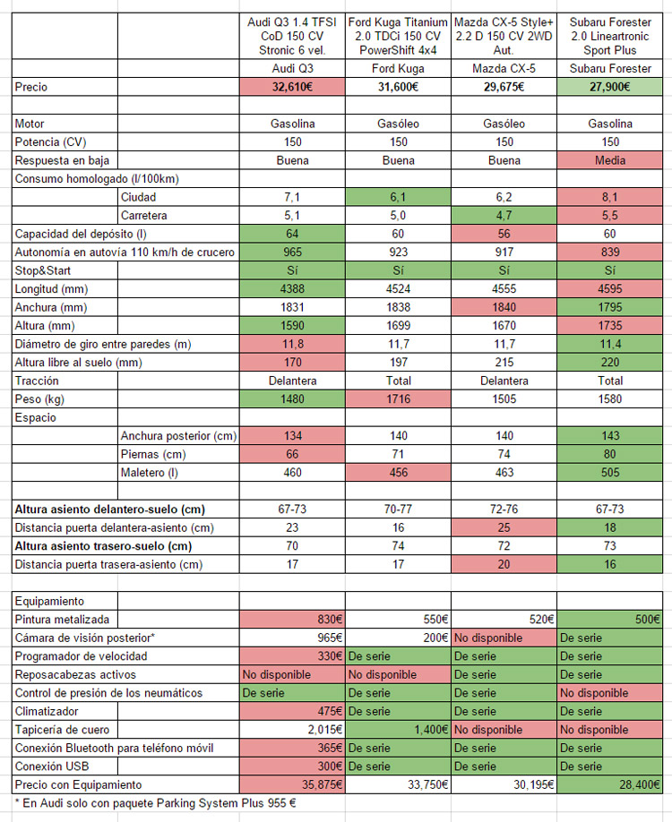 El Kuga ni gana ni pierde en 17 conceptos o mediciones, el CX-5 en 14, el Q3 en nueve y el Forester dos. (Las casillas blancas en las que ninguna gana ni pierde no las contabilizo).
