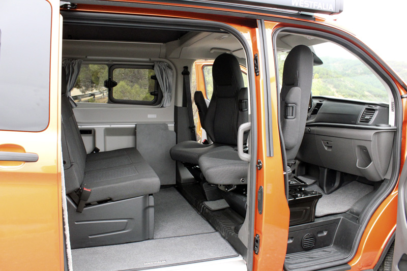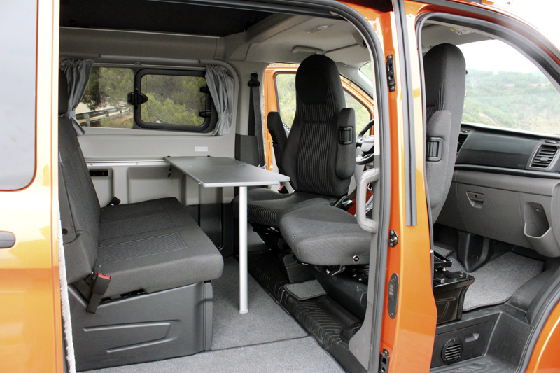 Esa zona estática contrasta con el resto de la Nugget: El techo se eleva para permitir caminar por el interior sin agacharse, los asientos delanteros se giran para crear una salita de reuniones, una mesa se pliega y despliega y los asientos de la segunda fila pueden convertirse en la segunda cama, más estrecha que la cama superior. De hecho, para dormir una familia de cinco personas, lo más recomendable sería subir a los niños a la litera de arriba y dejar a los padres en la cama menos ancha disponible abajo.