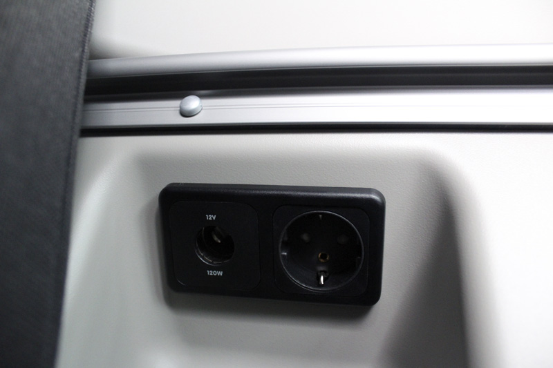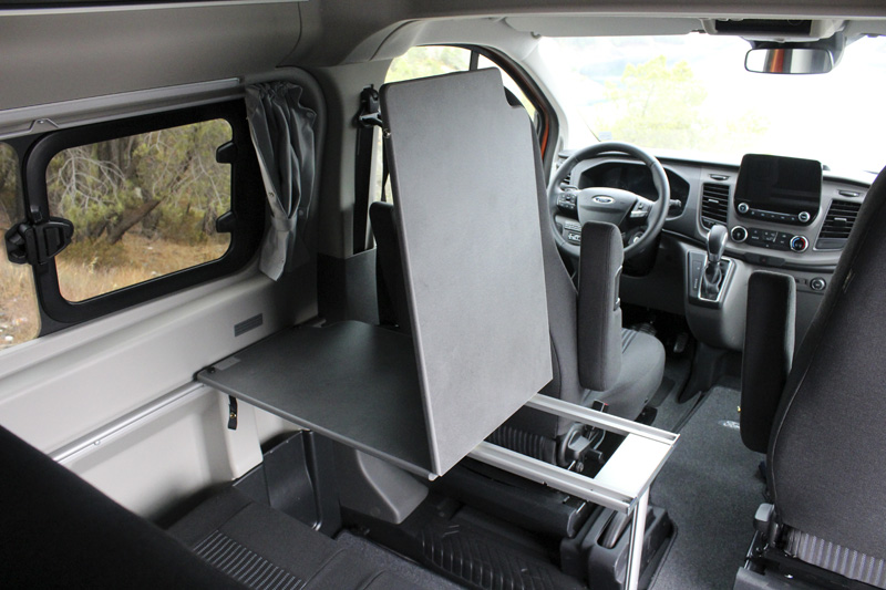 La puerta lateral corredera da acceso a la zona de reunión interior. En esta foto, salvo por el techo levantado, la disposición de todos los elementos es la normal para circular con la Nugget. Asientos delanteros mirando hacia el frente, mesilla plegada en su posición y asientos de la segunda fila con el respaldo en posición vertical.A los asientos delanteros se les da la vuelta con facilidad. No llegan a girar 180 grados, pero el giro es sufiente como para estar cómodamente sentado, de frente a los ocupantes de la segunda fila de asientos. Este espacio se puede utilizar con mesa y sin mesa central. La mesa tiene buen tamaño, aunque quizá se quede un poco lejos para los dos ocupantes situados en los asientos más cercanos a la puerta. Conviene desplegar la mesa antes de girar los asientos. Es posible que se pueda desplegar una vez girados, pero yo no he encontrado cómo hacerlo. Por tanto, primero desplegar la mesa y segundo, girar los asientos.La mesa, que va fijada al costado izquierdo de la Nugget para los desplazamientos, tiene un soporte corredero muy útil, porque permite desplazarla longitudinalmente. Tiene otro soporte, este extensible y en el otro extremo, para poder desdoblarla y que apoye bien.Enchufes situados a la izquierda de la segunda fila de asientos, justo por delante del respaldo, en esta zona de despacho, de juegos, de comedor o de lo que cada usuario del coche imagine.