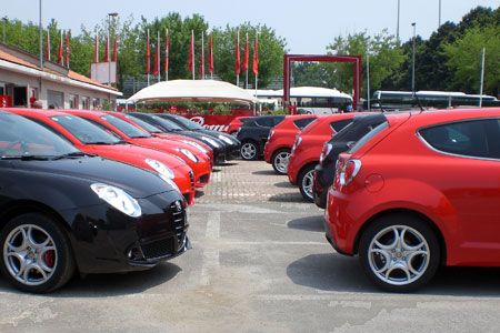 Última foto de la presentación del Mito. Todos éstos y muchos más eran los coches a disposición de los periodistas. Yo conduje el cuarto de la derecha.