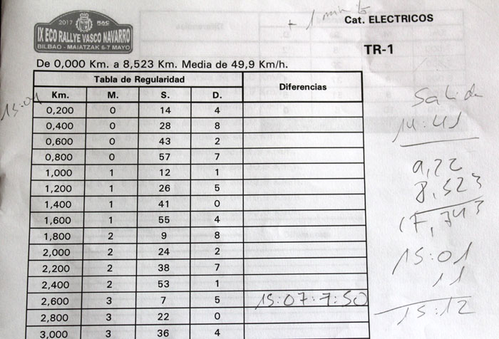 IX Eco Rally Vasco Navarro 2017. Tabla de regularidad. Primera etapa