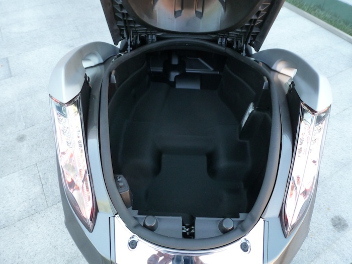En la Satelis, el acceso al hueco que hay debajo del asiento no es tan bueno como en otros scooter porque no se levanta la tapa al completo. Es un hueco largo y estrecho, en comparación con el del Burgman, de mucha mayor anchura. Según Peugeot caben dos cascos integrales. Es posible con algunos cascos, pero que estas afirmaciones siempre están sujetas al tamaño de los cascos. No me gusta el sistema de apertura del baúl mediante la llave. A diferencia de lo que ocurre en otros scooter, el asiento se abre automáticamente al girar la llave hacia la derecha, como al darle al contacto. He abierto demasiadas veces el baúl inadvertidamente.