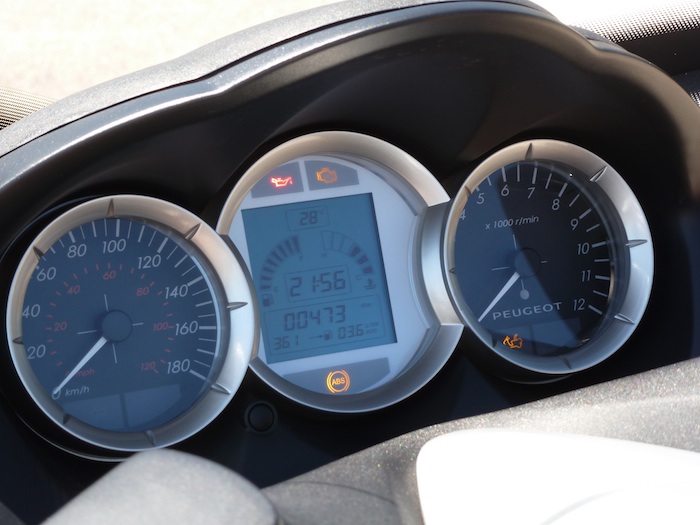 La instrumentación del Satelis es mucho mejor que la del Burgman, dónde va a parar, aunque no encuentro utilidad en el cuenta revoluciones. También es mejor la posibilidad de llevar ABS, que no está disponible en el Burgman. En el Satelis me ha entrado una vez el ABS, en una frenada fuerte con la rueda posterior, pero dudo de que hubiera ocurrido algo si no hubiera entrado. Bloquear la rueda posterior en una frenada no es problema con estas motos. El susto puede provenir de una frenada fuerte con la rueda delantera, pero en ningún ocasión he tenido ese problema con mi scooter (seguramente porque soy muy prudente con el freno delantero). De hecho, desconozco cuánto se puede frenar con la rueda delantera en mi scooter (y tampoco en el Satelis de Peugeot). En ocasiones, cuando lo he necesitado, me sorprende lo mucho que frena mi moto con la rueda delantera. Sé que debe poder frenar más, pero no me atrevo a probar hasta el límite porque me da miedo irme al suelo.