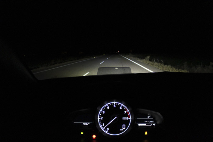 Antes de mi recorrido, para que los faros estén bien limpios, toca la foto con las luces de carretera. En este enlace se puede comparar con el haz del CX-3, que ilumina claramente mejor los bordes de la carretera.