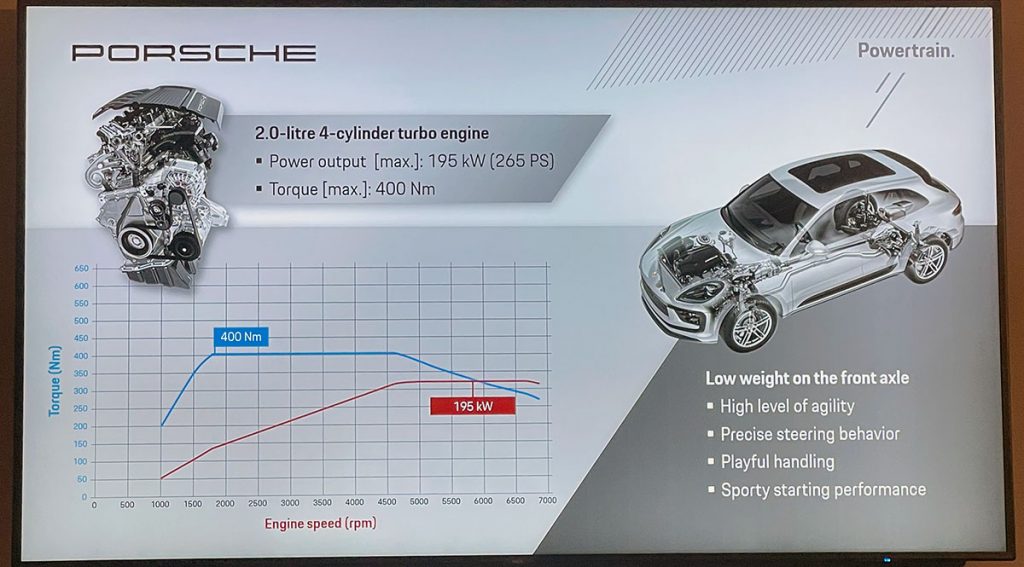 El motor de cuatro cilindros pesa casi 60 kilogramos menos que el de seis cilindros en V del Macan S, circunstancia que facilita un mejor rendimiento del eje delantero en curvas. En combinación con esta ligereza, una suspensión rebajada y un equipamiento que permite aprovechar mejor las características del coche se traducen en una capacidad de pasar por las curvas a velocidades estratosféricas, habida cuenta de la configuración de la carrocería de este coche.