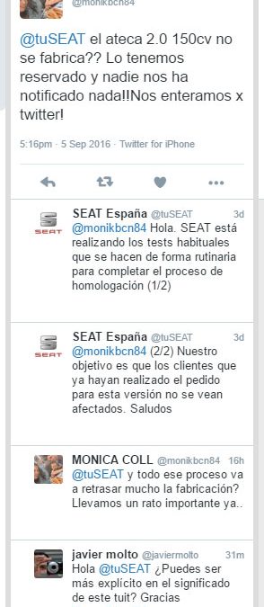 Sin embargo, días después cambian de discurso y dicen en Twitter y en FB que se debe a un cruce de consultas. Lo siento por Seat, pero eso es imposible creérselo. No digo que mientan, sólo digo que yo no me creo que eso del «cruce de consultas» pueda ocurrir tantas veces y tan bien argumentado en momentos distintos y en lugares distintos. Será verdad (y mira que es difícil que sea verdad), pero yo no me lo creo. Y por lo que veo, los futuros clientes de Seat, tampoco.