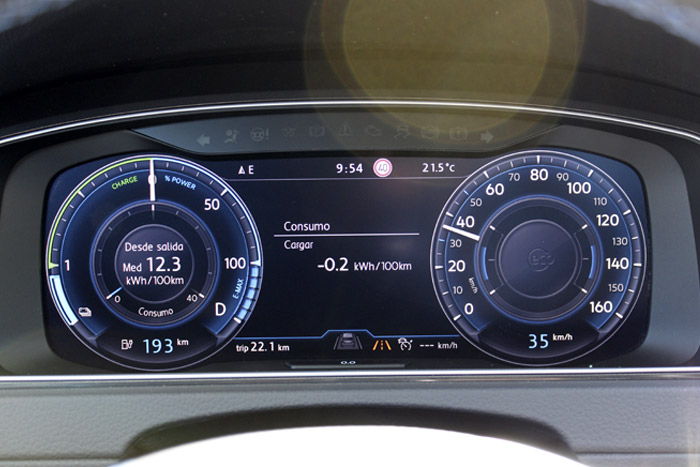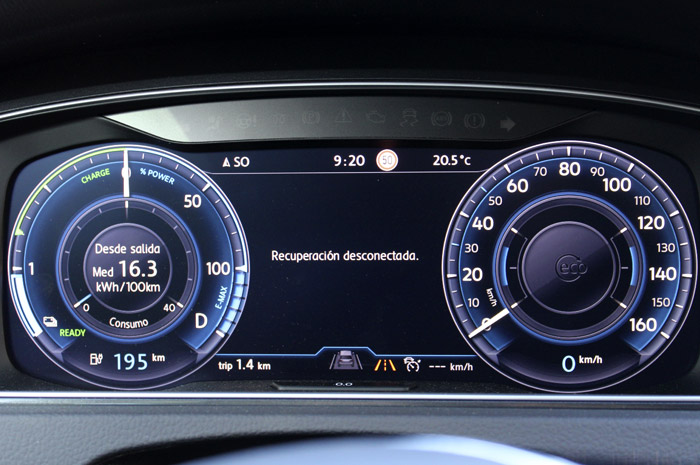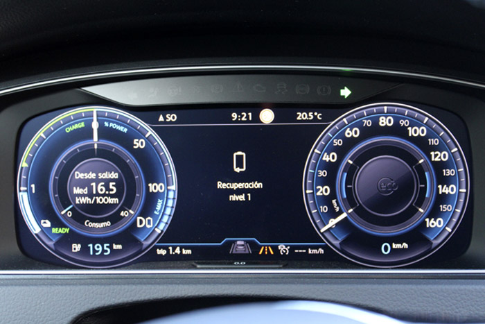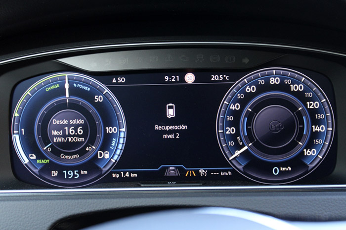 Pruebo en circunstancias similares con la recuperación en «Nivel 1» e indica una recuperación de energía de 10,3 kWh cada cien kilómetros. Entiendo que si el cálculo es correcto, en este momento está cargando a una potencia aproximada de 2 kW.