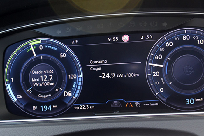 En el nivel 2, y a una velocidad de 30 km/h, recupera energía a razón de 24,8 kWh/100 km, lo que permite inferir que en este instante carga con una potencia de 7,5 kW. Es una buena potencia, pero sólo durante unos instantes.